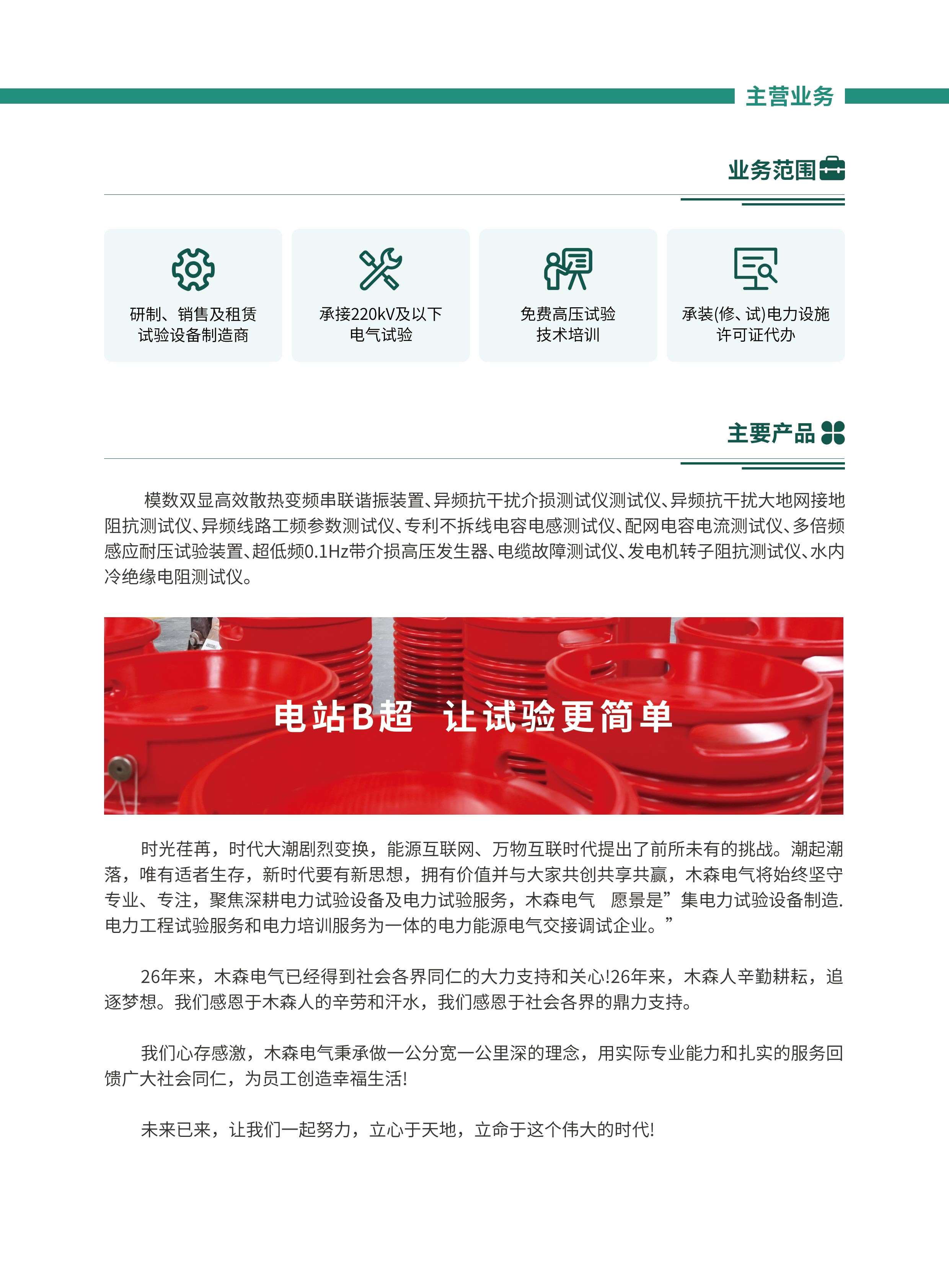 - 武漢市木森電氣有限公司成立于1996年 8月,是承裝(修、試)電力試驗設(shè)備生產(chǎn)廠家,,專業(yè)從事串聯(lián)諧振、無局放試驗變壓器、交直流高壓測試儀等變電站電力試驗測試設(shè)備和輸電線路檢測設(shè)備的研究開發(fā)、生產(chǎn)銷售和服務(wù)于一體高新技術(shù)企業(yè)。始終堅持“高品質(zhì) 好服務(wù) 講誠信 樹品牌”12字方針,專注電力試驗產(chǎn)品和電力試驗服務(wù),與近萬家企業(yè)成功合作。 武漢市木森電氣有限公司是湖北電力機電行業(yè)協(xié)會、湖北省電力企業(yè)服務(wù)協(xié)會、湖北電力計量測試協(xié)會的會員單位,是武漢電力職業(yè)技術(shù)學(xué)院實習(xí)研發(fā)基地、三峽電力職業(yè)技術(shù)學(xué)院實習(xí)基地、九三學(xué)社國網(wǎng)電力科學(xué)研究院高壓支社木森活動基地。