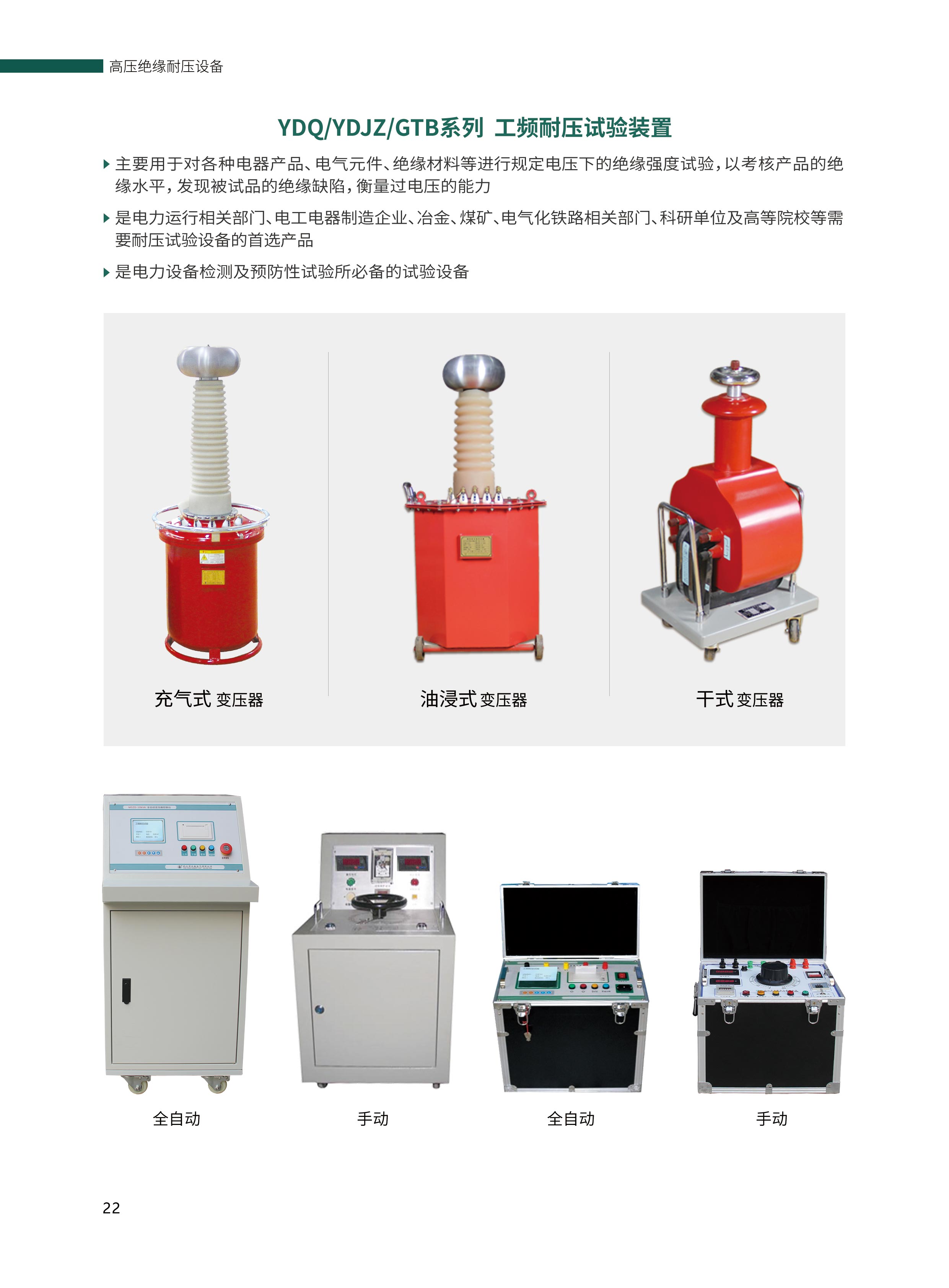 YDQ/YDJZ/GTB系列工頻耐壓試驗裝置:適用范圍主要用于對各種電器產品、電氣元件、絕緣材料等進行規定電壓下的絕緣強度試驗,以考核產品的絕緣水平,發現被試品的絕緣缺陷,衡量過電壓的能力。
